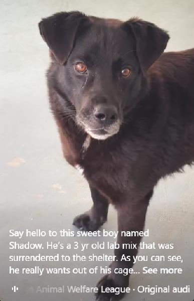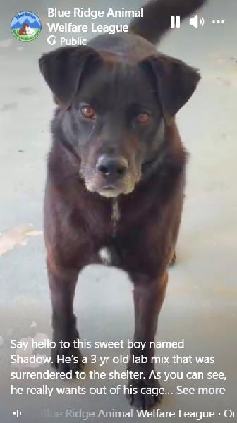 Notes: Shadow is a 3 year old Lab mix that was surrendered to the shelter. As you can see in the video, he really wants out of his cage and loves nothing more than playing and chasing treats. He is very food motivated and should be a great dog to train. If you are interested in Shadow, please visit the Patrick County Public Animal Shelter. Adoption fees are $10 and include spay/neuter surgery and rabies vaccine.