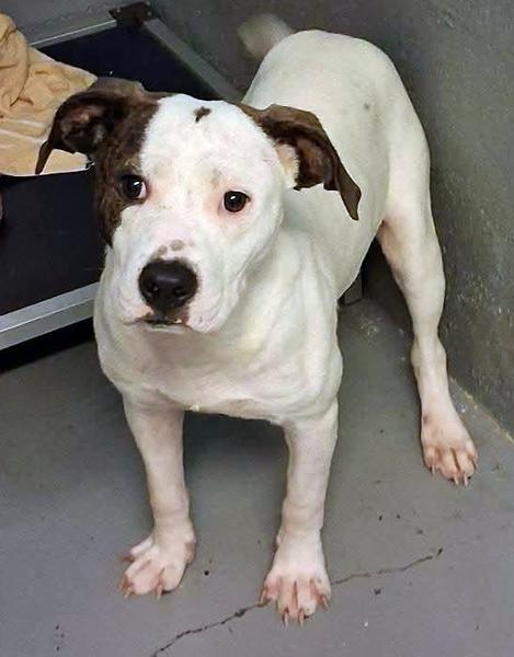 Notes: Boseman, American Bully Mix, Young, Male, Medium, White, Brindle. Brave, Loves, Loyal.